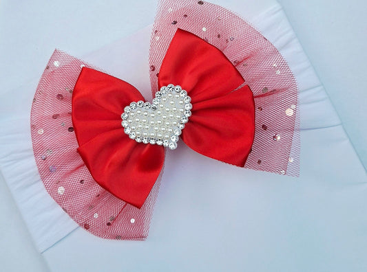 ❤️Valentines 🎀 Large Satin/Tulle Heart Centre Bow🎀Available On Headband Or Clip(Choose Colour)