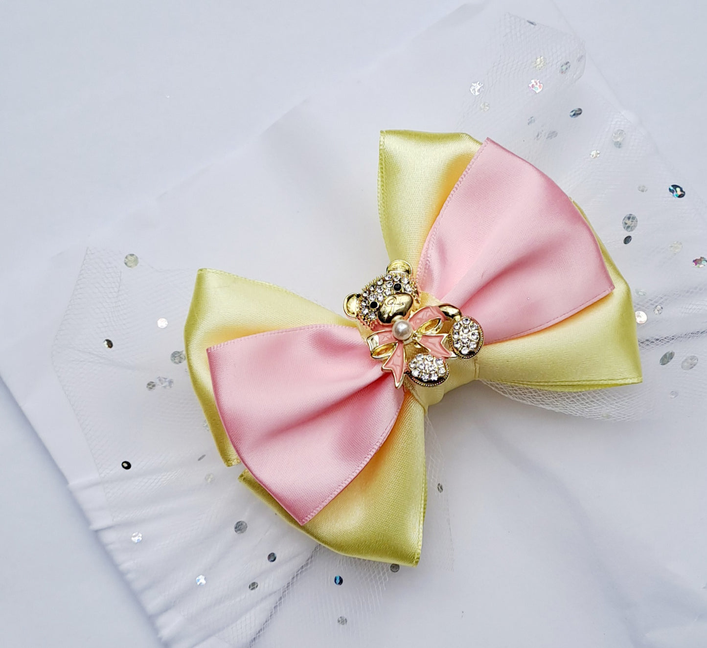 🎀 Large Yellow&Pink Satin Bow/ Glitter Tulle Headband🎀